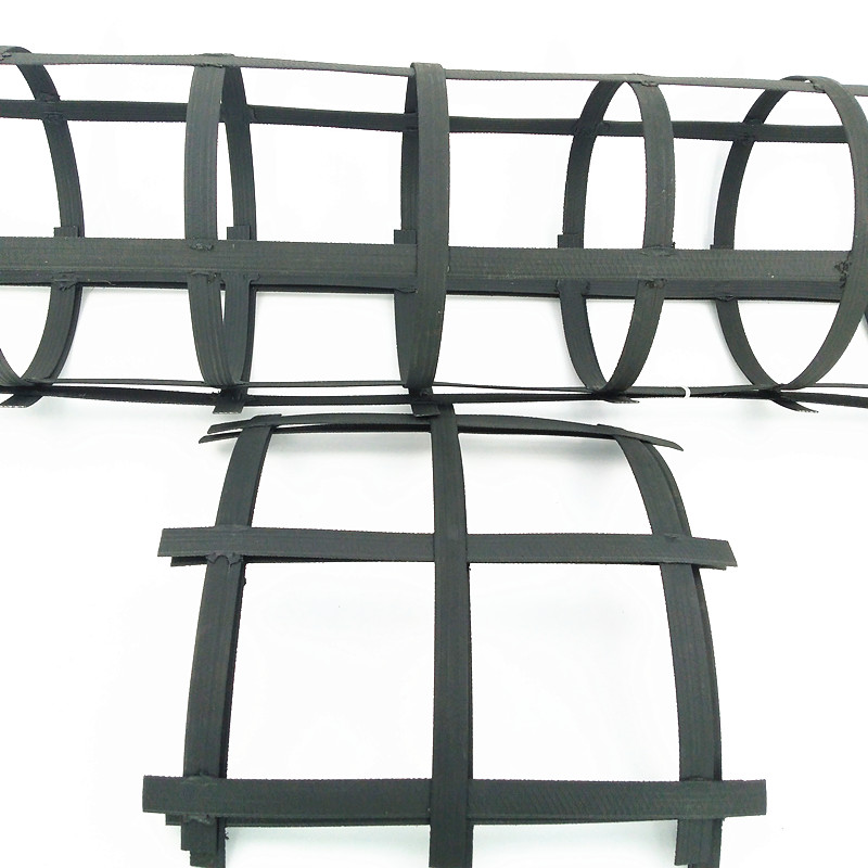 此产品以高强钢丝(或其他纤维),经特殊处理,与聚乙烯(PE),并添加其他助剂,通过挤出使之成为复合型高强度抗拉条带,且表面有粗糙压纹,则为高强加筋土工带。由此单带,经纵、横按一定间距编织或夹合排列,采用超声波焊接而成。