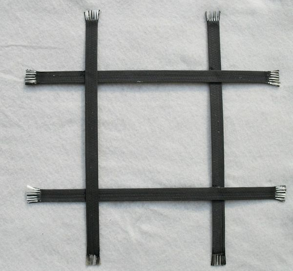 此产品以高强钢丝(或其他纤维),经特殊处理,与聚乙烯(PE),并添加其他助剂,通过挤出使之成为复合型高强度抗拉条带,且表面有粗糙压纹,则为高强加筋土工带。由此单带,经纵、横按一定间距编织或夹合排列,采用超声波焊接而成。
